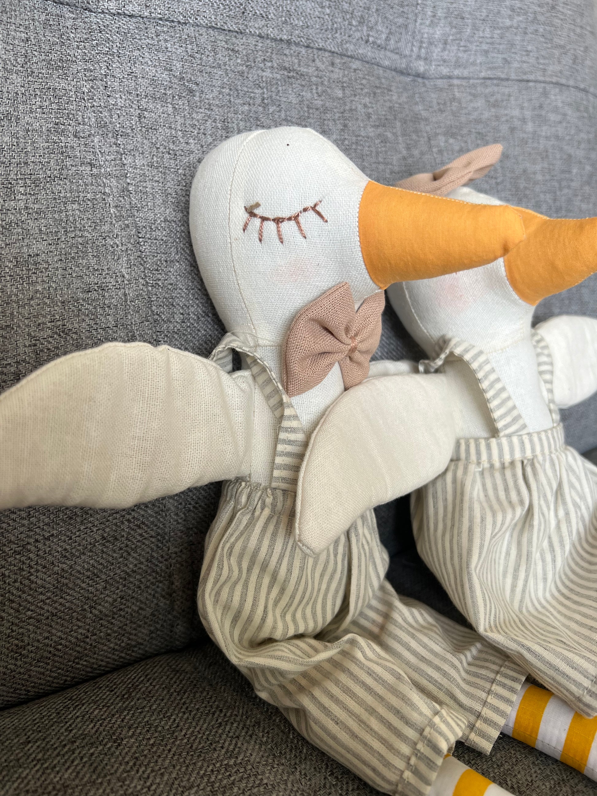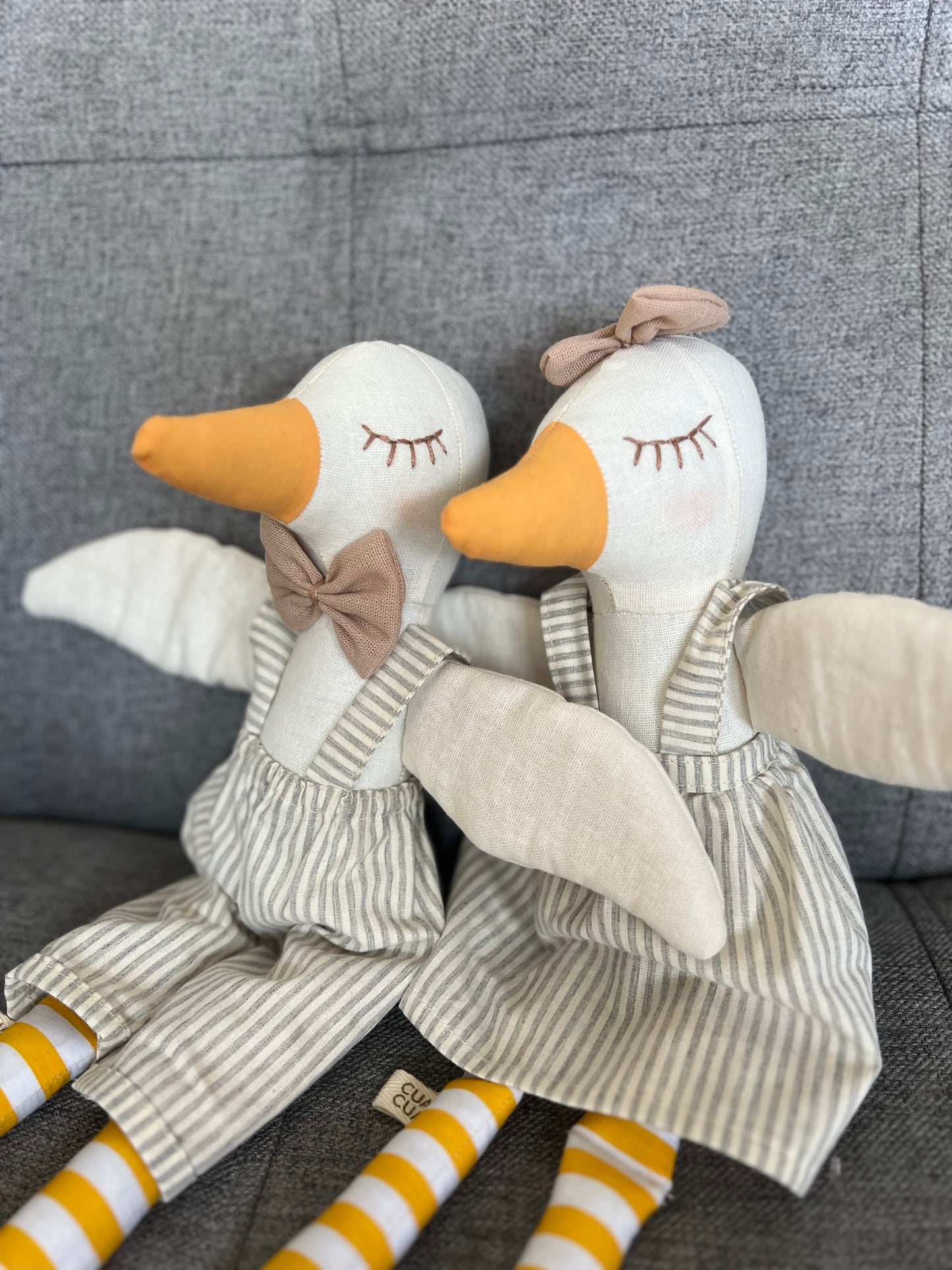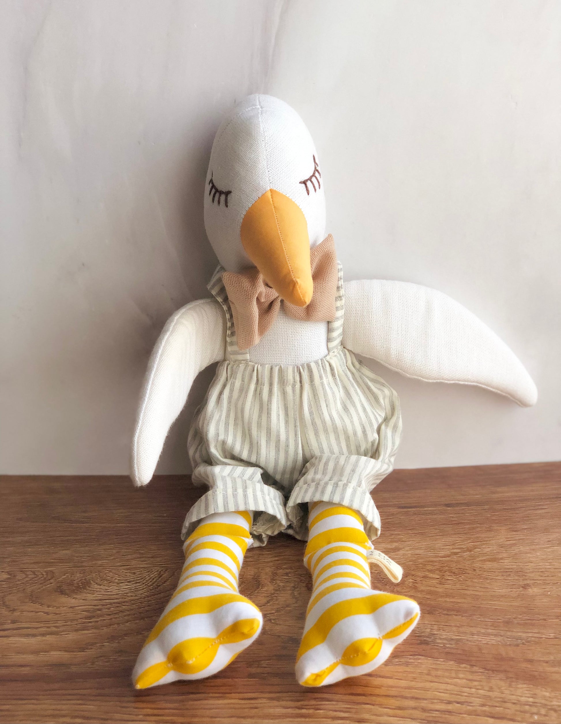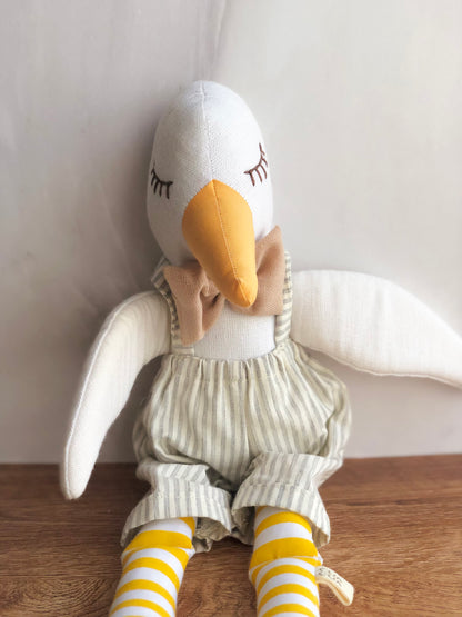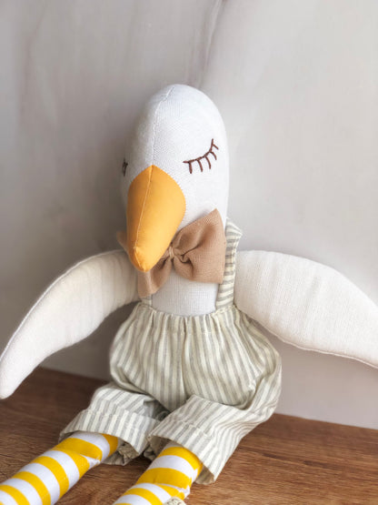 Patito grande de tela con overall de lineas grises y moño café