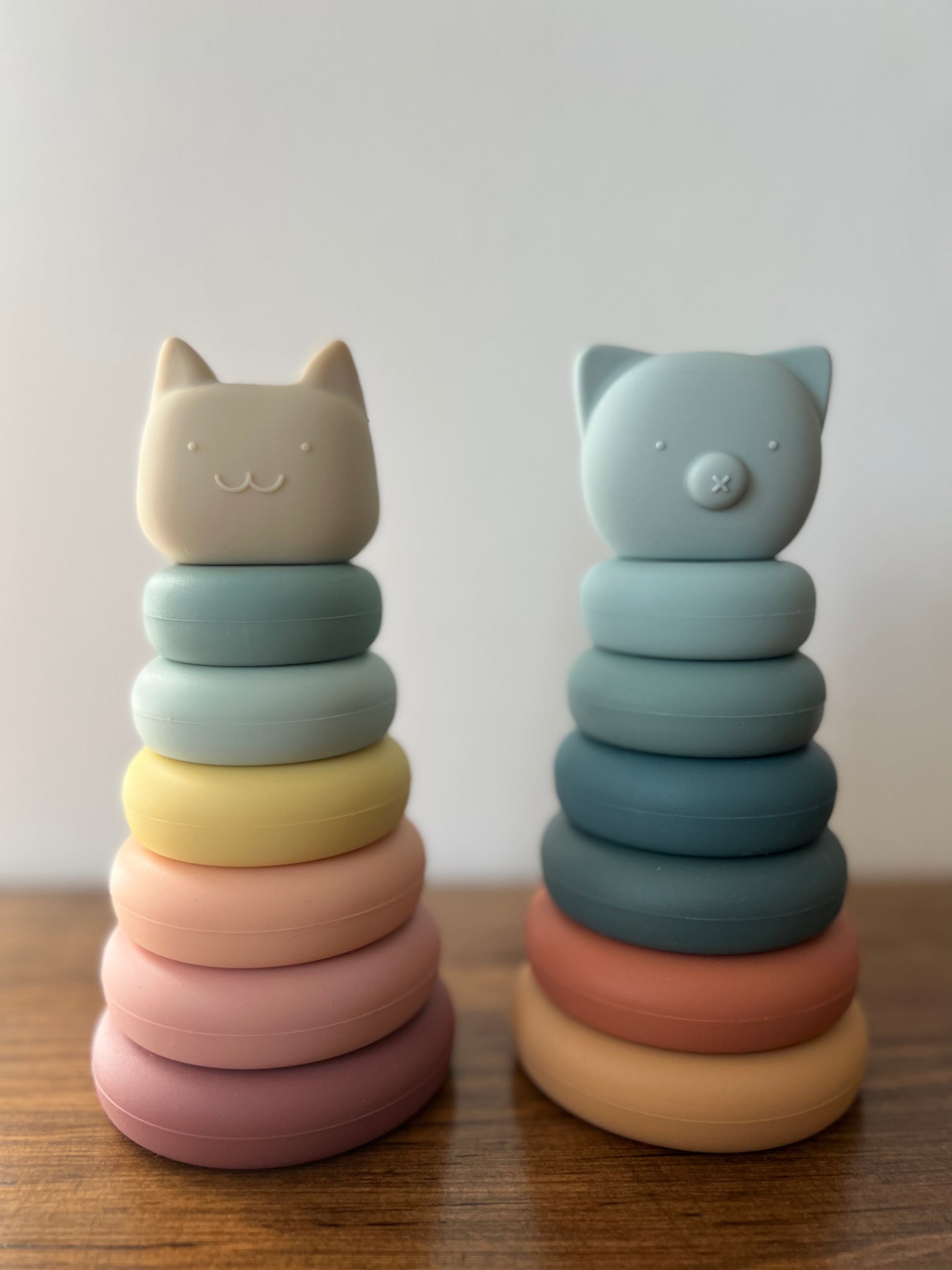 La torre más linda y segura para tu bebé. Hecha totalmente de silicón grado alimenticio, esta torre sirve como un juguete al apilarla, o como una mordedera.