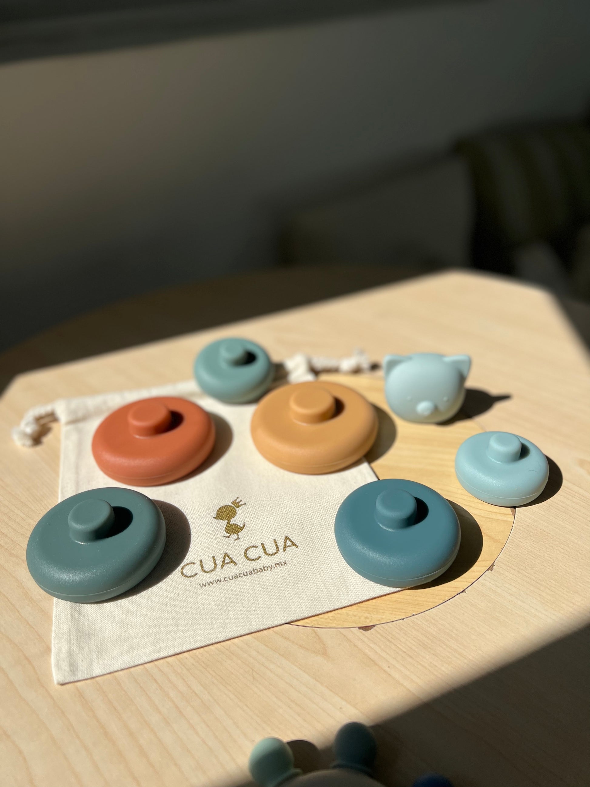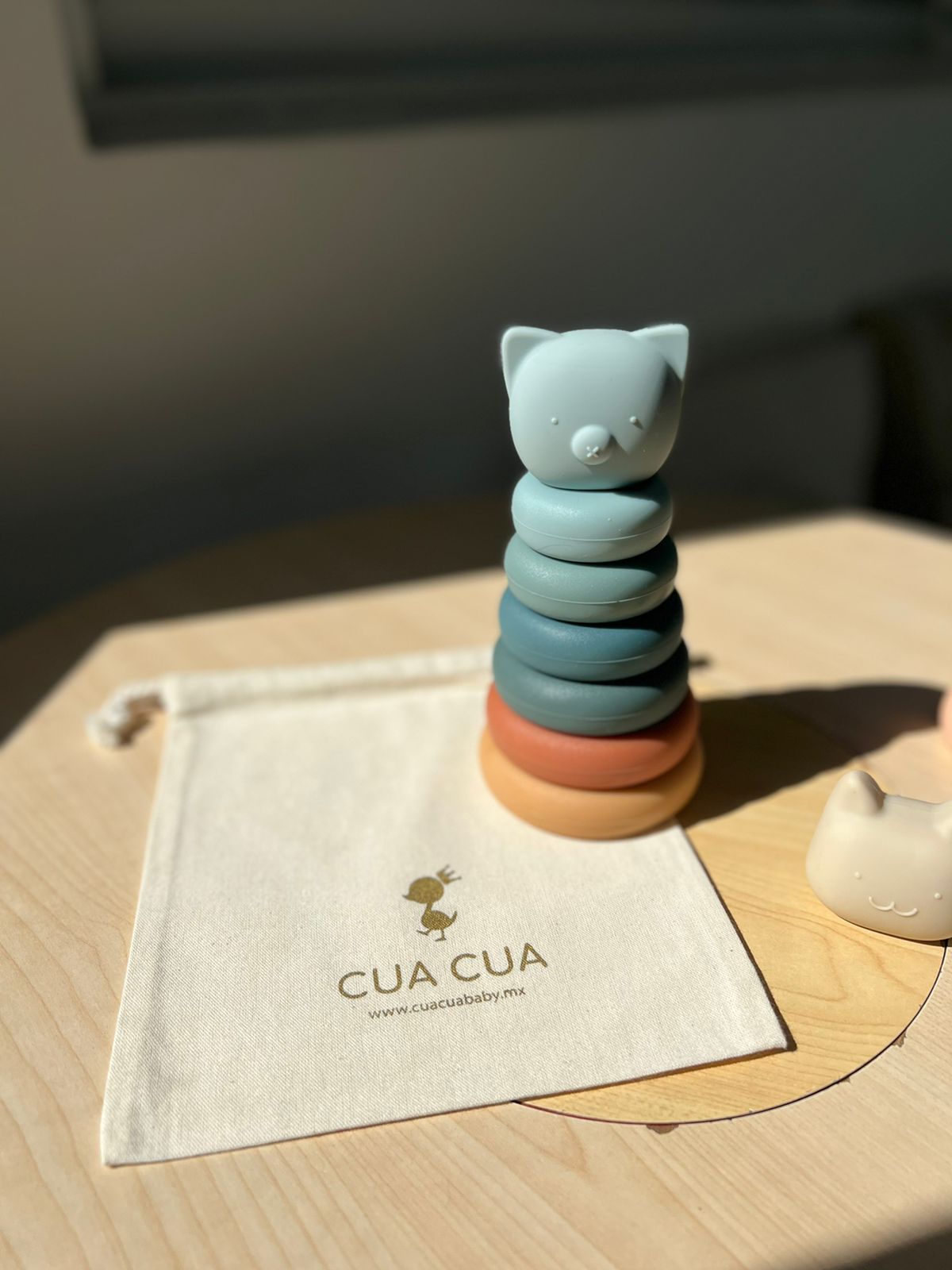 Incluye torre de apilar de silicón y una bolsita de manta para guardar y llevar contigo a todas partes